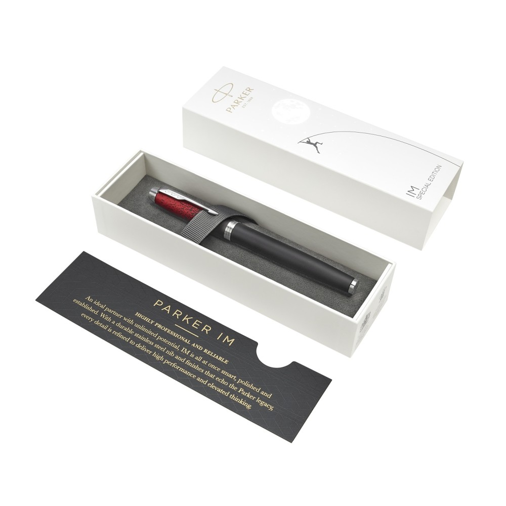 Специальное издание Parker Special Edition 2019 года в популярной коллекции IM Core посвящено стремлению человека к познанию космоса, далеких миров и нашего места во вселенной. Каждая серия ручек так или иначе связана с космической тематикой. Корпус перьевой ручки Parker IM SE 2019 Red Ignite выполнен из ювелирной латуни и покрыт черным матовым лаком, а колпачок украшен оригинальным рисунком в виде красных искр пламени, который символизирует огонь, вырывающийся из сопл стартующей ракеты. Ручка поставляется в специальной подарочной коробке с изображением человека, пытающегося допрыгнуть до Луны. Эта уникальная серия предназначена для активных людей, увлекающихся современными технологиями, астрономией, космической тематикой, а также для всех, кто находится в поиске своего места в жизни, занимает активную жизненную позицию и постоянно стремится достигать новых вершин. Не каждый может разработать космический корабль, чтобы долететь до Луны, но каждый может стремиться к своей личной цели и быть завтра лучшей версией себя сегодня - в этом вам поможет новая серия ручек Parker IM Special Edition 2019 Reg Ignite!